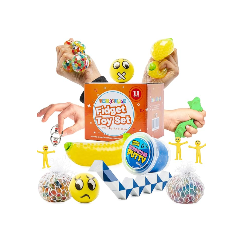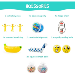 Ce kit Fidget se compose de pas moins de 11 fidgets, allant des balles anti-stress, de la banane spongieuse, du puzzle switch au mastic.