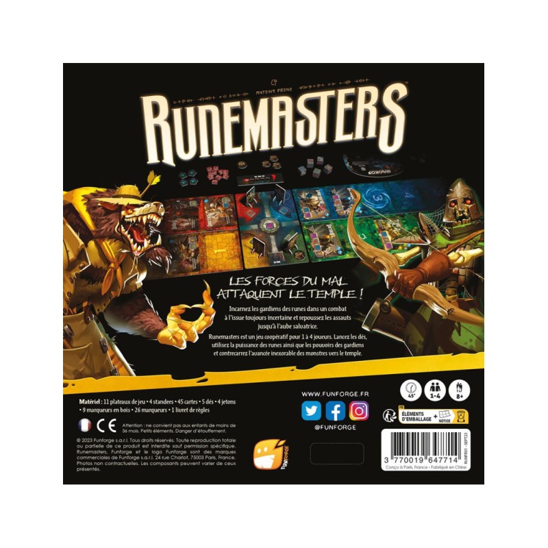 Le temple est en danger. Les ténèbres s’étendent et des hordes de créatures monstrueuses s’apprêtent à tout détruire. Runemasters, édité par Funforge, vous plonge dans un univers heroic-fantasy haletant où la coopération est votre seule arme pour repousser l’invasion. En solo ou en équipe jusqu’à 4 joueurs, incarnez les Gardiens des Runes et défendez le Temple de l’Humanité contre des ennemis implacables : loups-garous, trolls, squelettes archers et guerriers démoniaques.